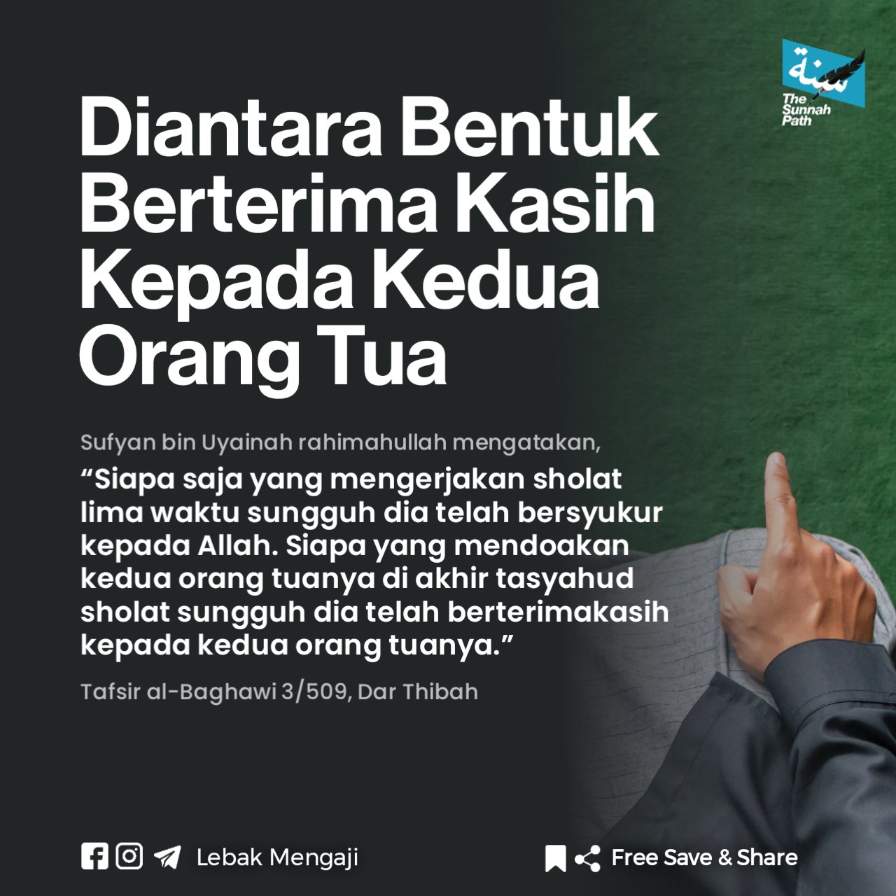 “Siapa saja yang mengerjakan sholat lima waktu sungguh dia telah bersyukur kepada Allah. Siapa yang mendoakan kedua orang tuanya di akhir tasyahud sholat sungguh dia telah berterimakasih kepada kedua orang tuanya.”