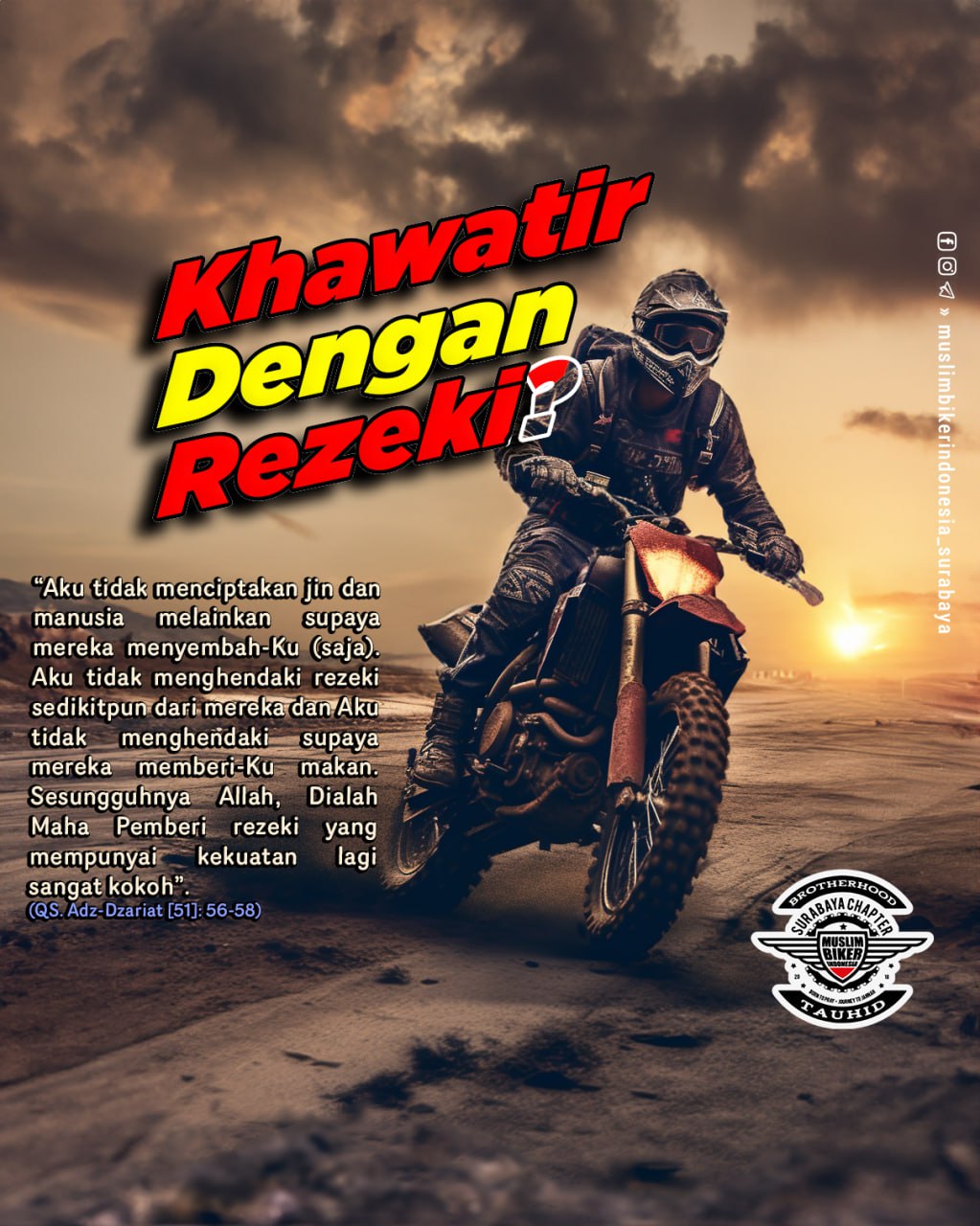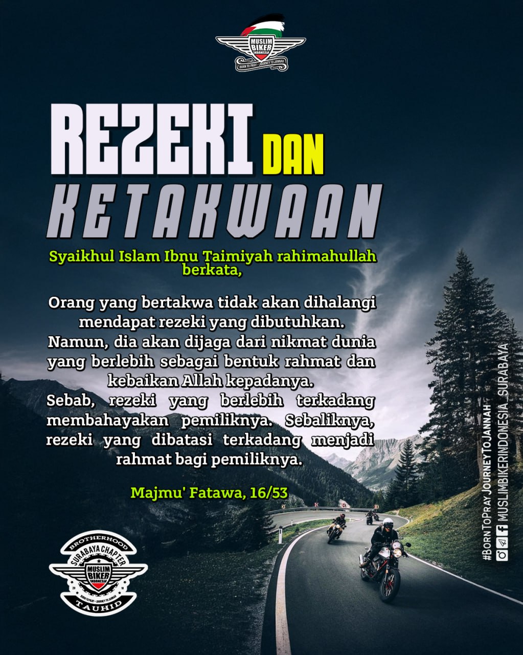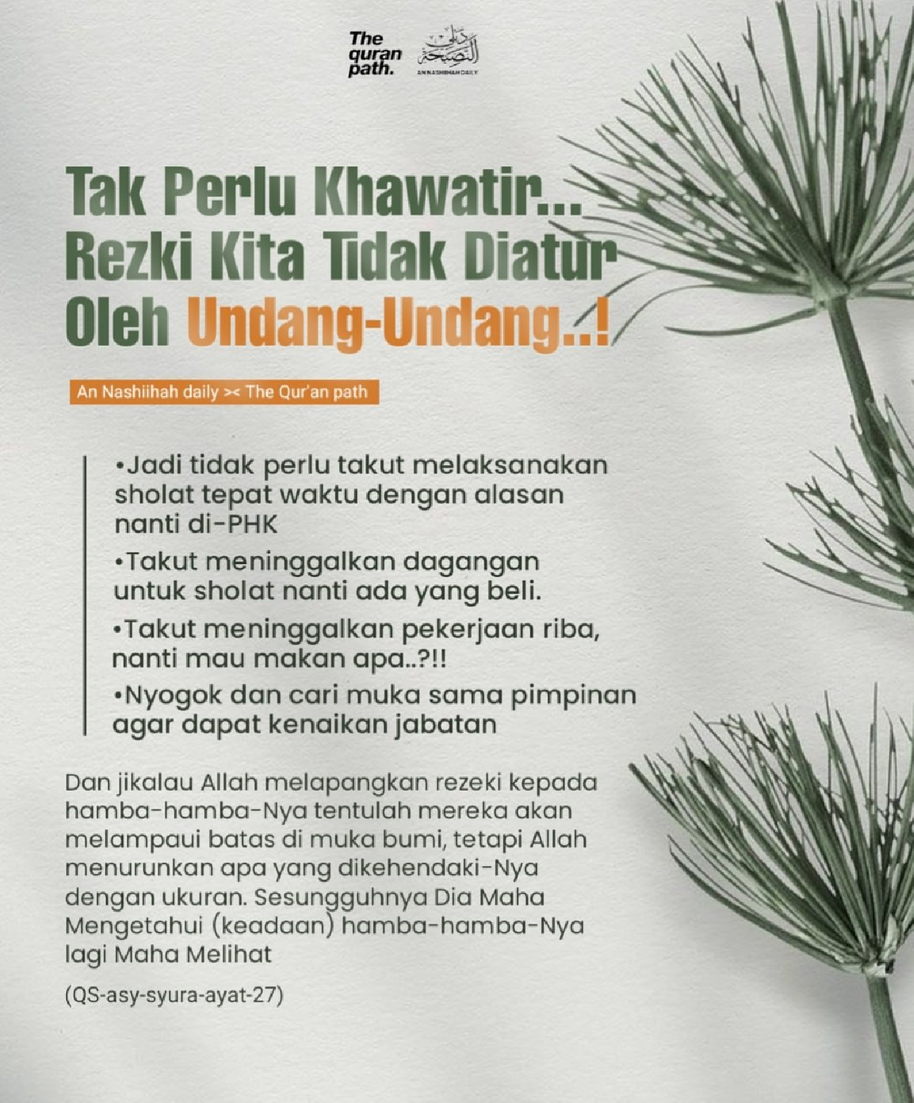 Jadi jangan khawatir, karena Allah ﷻ telah menjanjikan rizki yang cukup bagi setiap hamba-Nya yang bertakwa. Sebagaimana yang dijelaskan Al-Qur'an dalam surah Asy-Syu'ara ayat 27, “Dan jikalau Allah melapangkan rezki kepada hamba-hamba-Nya tentulah mereka akan melampaui batas di muka bumi, tetapi Allah ﷻ menurunkan apa yang dikehendaki-Nya dengan ukuran. Sesungguhnya Dia Maha Mengetahui (keadaan) hamba-hamba-Nya lagi Maha Melihat.”​